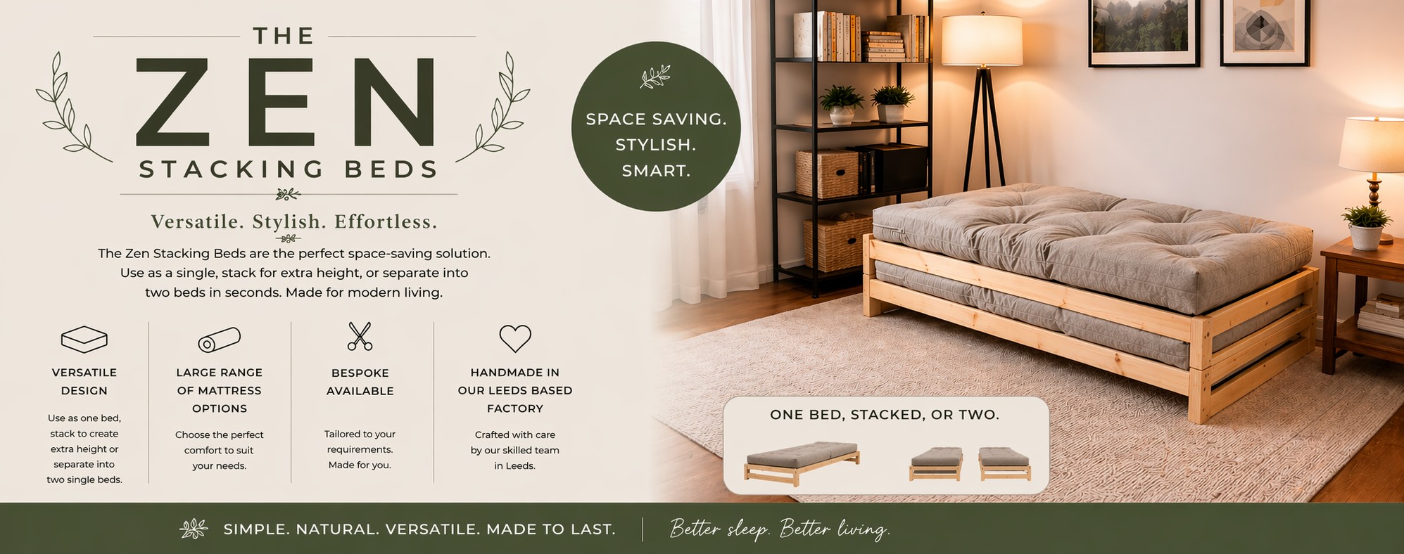 Many of our small sofa beds and futons are much more unique than those of other suppliers. The Funky Futon Company can manufacture your futon or sofa bed in many different timber finishes and fabrics, making for a more bespoke piece. Our compact sofa beds are easy-to-use and access-friendly, making them ideal for use in attic, loft and cellar conversions as well as in guest rooms, where a normal sized bed or sofa sleeper may struggle to fit. Our complete collection of Japanese futons come in all sizes, including single, double and king-sized, we can also cater for bespoke dimensions, contact us with your specifications and see how we can help create a futon to suit you! If you order your futons online or offline we offer prompt manufacture and delivery across the UK, or why not visit our well-established factory showroom in Leeds and check out our range of futons on offer before, "Maybe" leaving with one the same day? We have been manufacturing and selling quality futons, sofa beds and mattresses from our shop in Leeds for over 25 years, why not call us today on 0113 2945373 or e-mail us at info@funkyfuton.co.uk and see if we can help you find a Great Product to suit your needs.